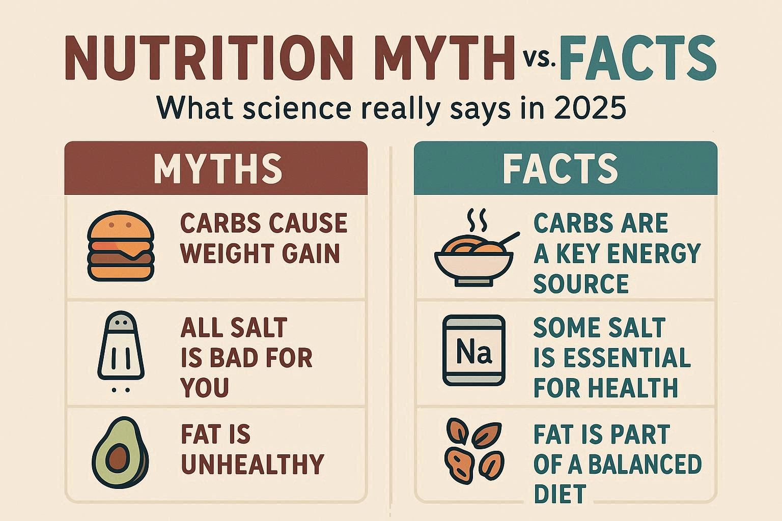 Nutrition myths have been around for decades, and while trends may change, the facts remain consistent. A healthy diet is not about extremes or quick fixes—it is about balance, variety, and sustainability. By understanding the truth behind common misconceptions, individuals can make informed decisions and create eating habits that support long-term health. In 2025 and beyond, the smartest approach is to keep it simple, stay consistent, and trust science over fads.